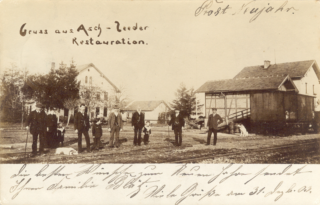 Postkarte aus dem Jahr 1903 von der Station Asch-Leeder mit der Bahnhofsrestauration (heute „Zum Blätz) und dem Bahnhofsgebäude, Letzteres wurde bereits 1978 abgebrochen.